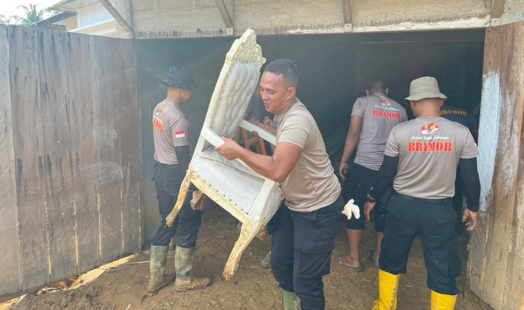 Brimob Polda Sumut Laksanakan Gotong Royong Pembersihan Rumah dan Gudang Warga Terdampak Bencana