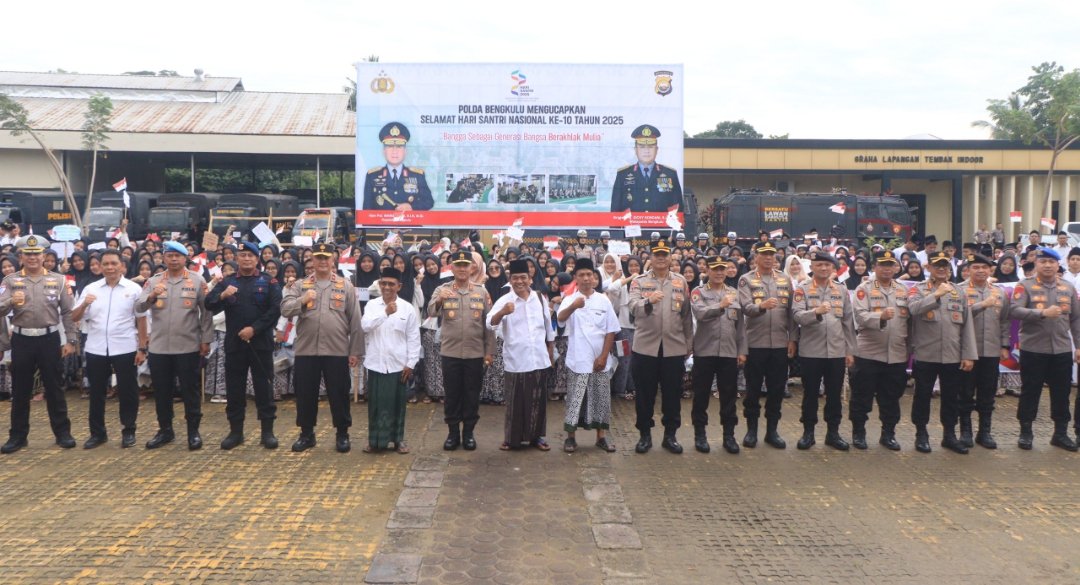 BENGKULU – Dalam semangat kebersamaan dan penghormatan terhadap perjuangan para ulama serta santri, Kepolisian Daerah Bengkulu melaksanakan kegiatan Peringatan Hari Santri Nasional ke-25 yang dipimpin langsung oleh Kapolda Bengkulu Irjen Pol. Mardiyono, S.I.K., M.Si. Kegiatan yang berlangsung pada Selasa (21/10/2025) di Lapangan Anton Soedjarwo ini turut dihadiri Wakapolda Bengkulu Brigjen Pol. Dicky Sondani, S.I.K., M.H., para Pejabat Utama (PJU) Polda Bengkulu, serta ratusan santri dan santriwati dari berbagai pesantren di wilayah Bengkulu.