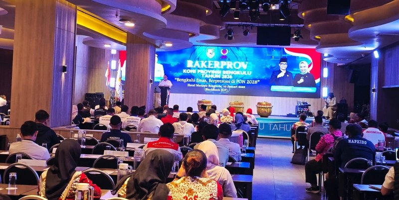 BENGKULU — Komite Olahraga Nasional Indonesia (KONI) Provinsi Bengkulu secara resmi menggelar Rapat Kerja Provinsi (Rakerprov) KONI Bengkulu Tahun 2026 dengan mengusung tema “Bengkulu Emas Berprestasi di PON 2028”. Kegiatan strategis ini dilaksanakan pada Sabtu (10/1/2026) pukul 09.00 WIB bertempat di Hotel Mercure Bengkulu, Kota Bengkulu.