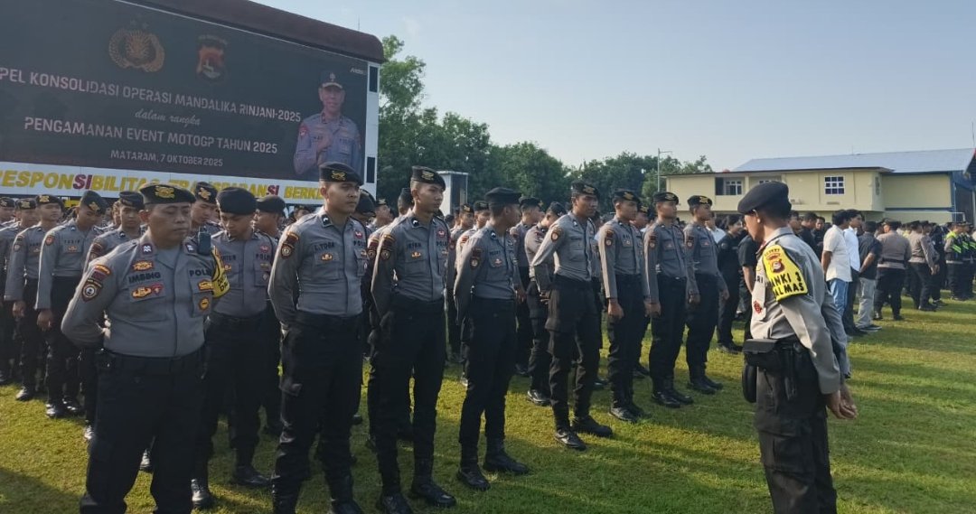 LOMBOK – Polda Nusa Tenggara Barat (NTB) menggelar Apel Konsolidasi Operasi Mandalika Rinjani 2025 usai dilaksanakannya pengamanan perhelatan akbar Pertamina Grand Prix of Indonesia (MotoGP) 2025. Ajang tersebut berlangsung dari 3 hingga 5 Oktober di Sirkuit Mandalika.